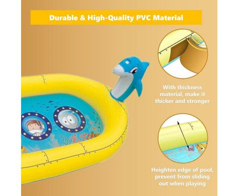 • Creativity Designs: Our inflatable sprinkler pool comes in 3 designs: Spaceship, Fire Engine and Submarine! It also has 2 spray water places which are the edge and the “tail”. You can also swing the “tail” to spray water outside the pool like a “water gun”. Enjoy sprinkler water on a hot day!