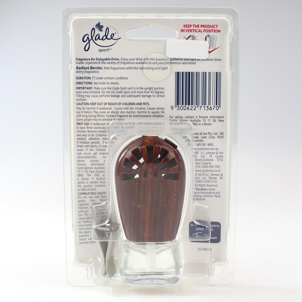 GLADE Glade Car Air Freshener Radiant Berries are at the fraction of the cost you normally pay, yet impressive and breathtaking. Experience 100% pure fragrance in the comfort of your car. Glade air freshener gives you a refreshing fragrance that lasts up to 75 days. Simply clip Glade freshener to your dash and enjoy.