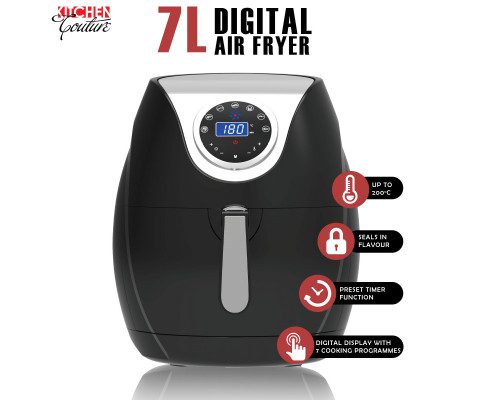 Embrace a new era of cooking convenience and healthiness with the Kitchen Couture 7 Litre Digital Air Fryer. This digital marvel is revolutionizing the way we prepare food by significantly reducing the need for oil, in stark contrast to conventional cooking methods. Yet, it manages to achieve that sought-after crispy exterior, rendering it a superior, healthier, and more user-friendly approach to crafting your beloved dishes.