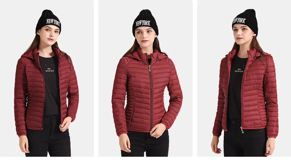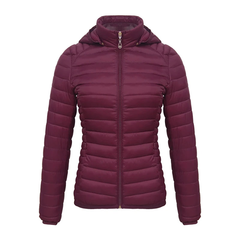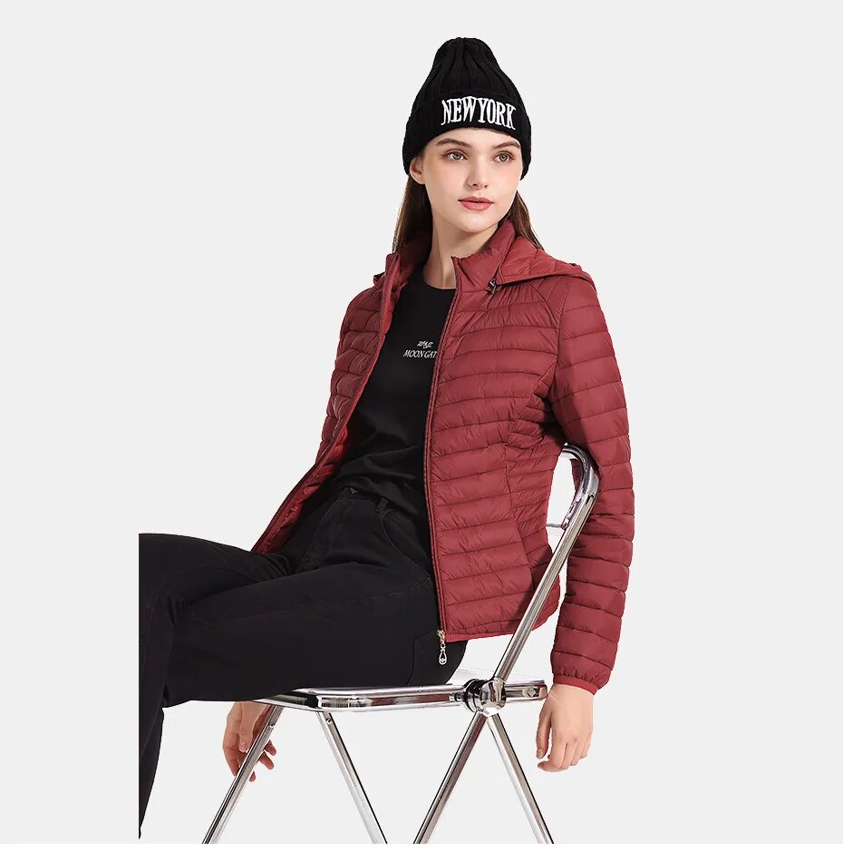 Women’s Puffer Jacket L Burgundy Lightweight Parka with Detachable Hood